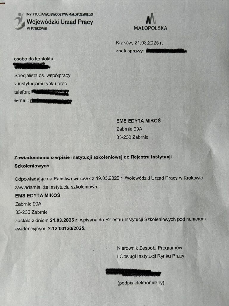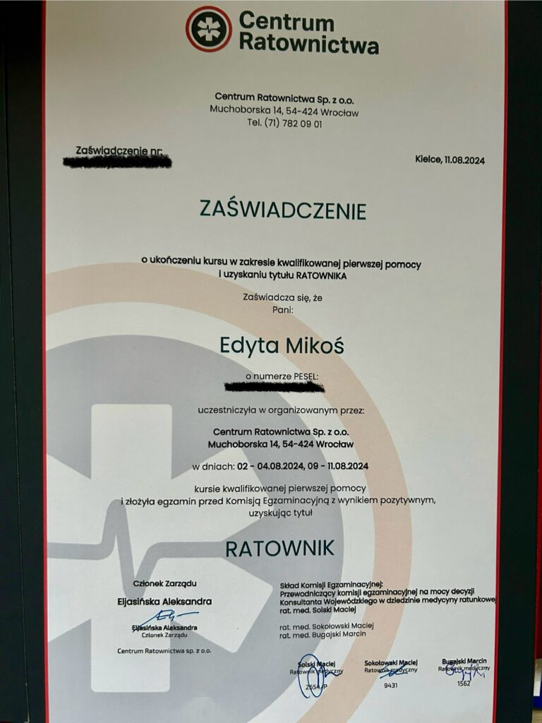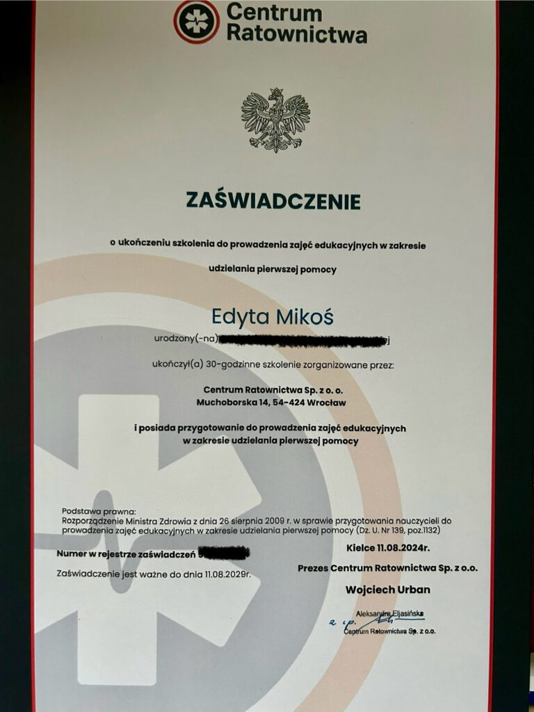 Nazywam się Edyta Mikoś. Jestem Ratownikiem Kwalifikowanej Pierwszej Pomocy oraz Instruktorem Pierwszej Pomocy. Ukończyłam studia podyplomowe z zakresu edukacji dla bezpieczeństwa oraz posiadam uprawnienia do prowadzenia zajęć edukacyjnych z zakresu pierwszej pomocy przedmedycznej.